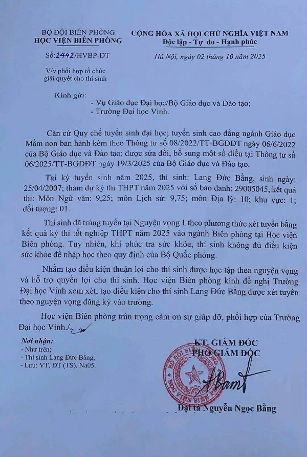 Nhằm tạo điều kiện để Lang Đức Bằng tiếp tục được theo học Khoa sư phạm Trường Đại học Vinh, là nguyện vọng 2 mà em đăng ký trước kỳ thi tốt nghiệp THPT, Học viện Biên phòng đã có văn bản gửi Vụ giáo dục Đại học/ Bộ Giáo dục và Đào tạo; Trường Đại học Vinh xem xét, tạo điều kiện cho thí sinh Lang Đức Bằng được học tập theo nguyện vọng.